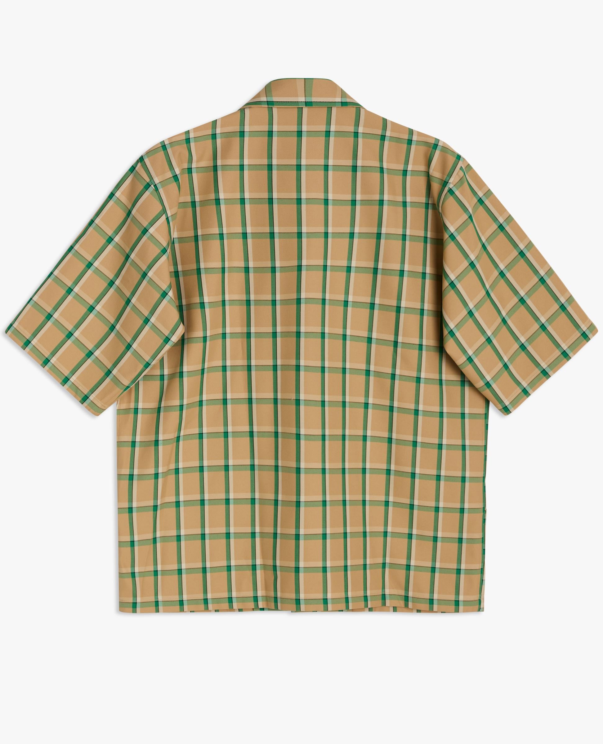 A cabana-styled shirt in a high-contrast checked pattern in a relaxed fit with a straight hem. Made of an Italian recycled polyester and cotton blend. Features two pattern-matched front pockets. Closes with eco-friendly corozo buttons.